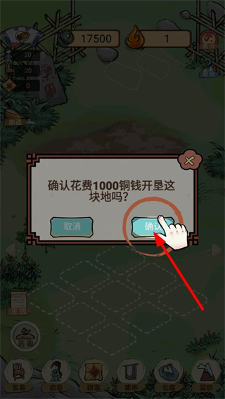 3、花費1000銅錢可開墾地塊,點擊確認按鈕即可開啟新地塊,為種植草藥做準備。