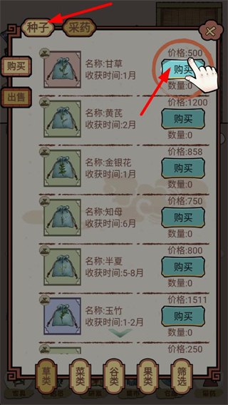 2、進入采藥界面,可購買甘草、黃芪等各類草藥種子,不同草藥收獲時間不同,按需選擇購買。