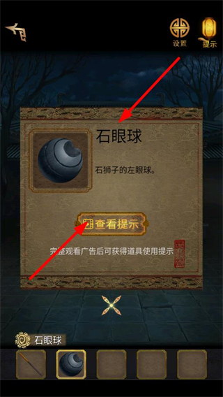 1、獲取道具石眼球,它是石獅子的左眼球,可通過查看提示了解使用方法,完整觀看廣告后能得到道具使用的相關指引。