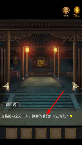 4、進入縣衙內部場景,角色裴思遠會疑惑衙內空無一人及執勤差役的去向,由此繼續展開后續的探案與線索搜尋。