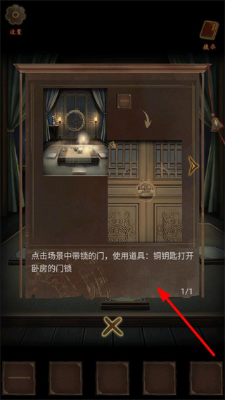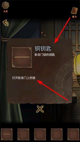 4、遇到帶鎖的門時,使用銅鑰匙可打開臥房的門鎖,按照提示使用道具解鎖,繼續探索密室。