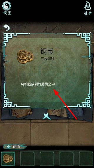 3、獲取銅幣后,可查看其用途,需將銅錢放到竹卦筒里面,了解道具功能以便使用。