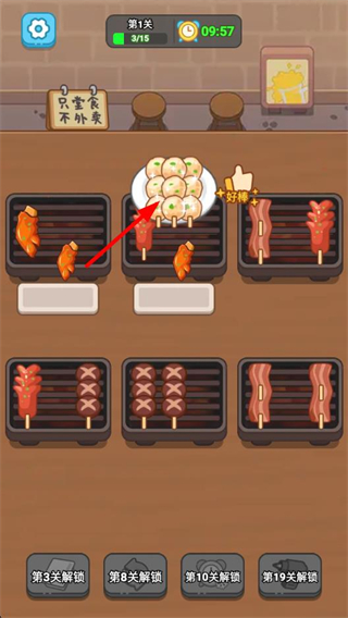4、按照訂單需求,將對應的烤串食材放到盤子里,完成本關的訂單任務,推進燒烤鋪的經營流程。