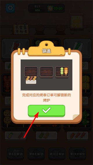 3、進入第2關后,查看鍋蓋對應的訂單提示,點擊確認按鈕,明確本關的烤串制作要求。