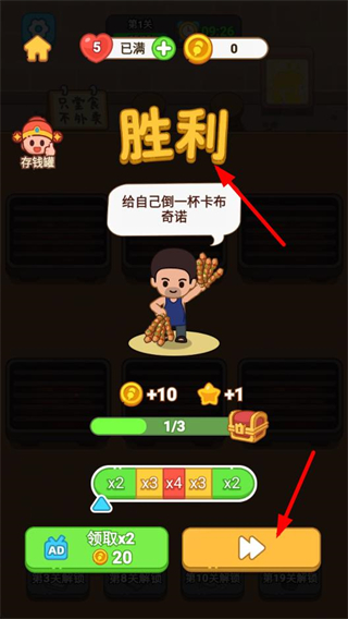 2、完成關卡后顯示勝利界面,獲取金幣和星星獎勵,點擊繼續按鈕進入下一個關卡。