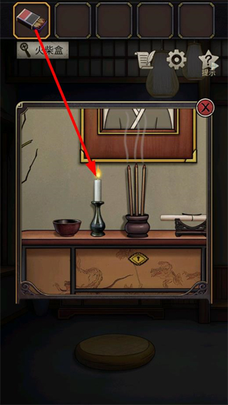 2、使用火柴盒點燃蠟燭,照亮場景,以便查看更多細節,發現新的解謎線索,如柜子上的機關。