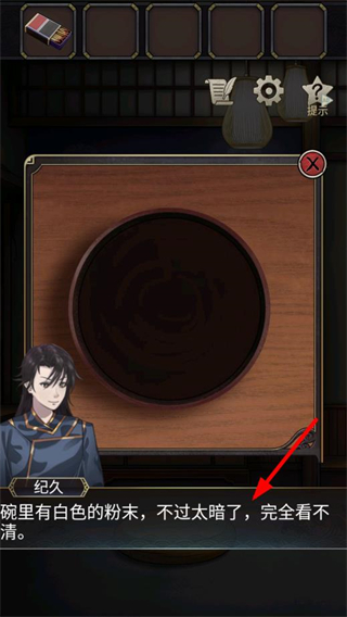 1、碗里有白色粉末但太暗看不清,需借助道具照亮,推進解謎進程,探索碗中粉末的秘密。