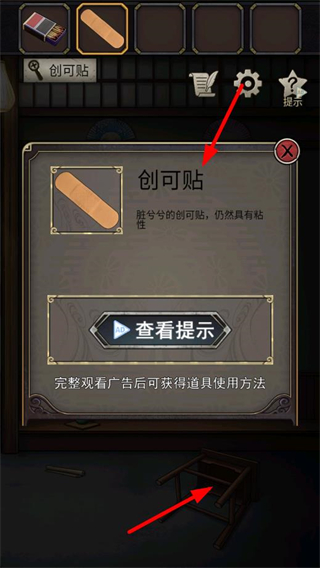 4、可獲取創可貼等道具,創可貼臟兮兮但仍有粘性,可觀看廣告查看提示,了解其使用方法,助力解謎。