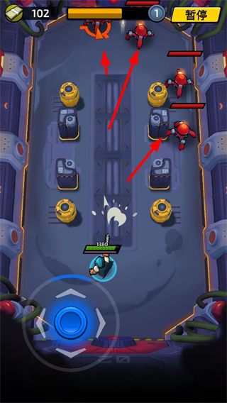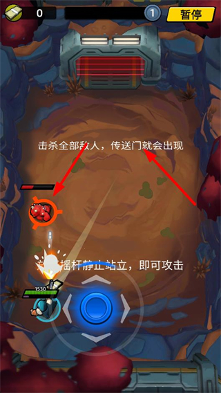 3、靜止搖桿觸發攻擊,擊殺場景里的敵人,完成目標后解鎖傳送門,體驗射擊戰斗的玩法,增強游戲的戰斗維度。