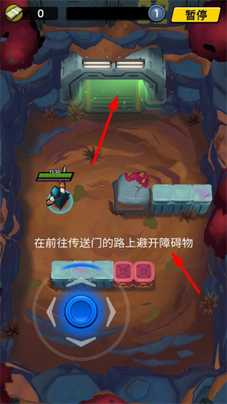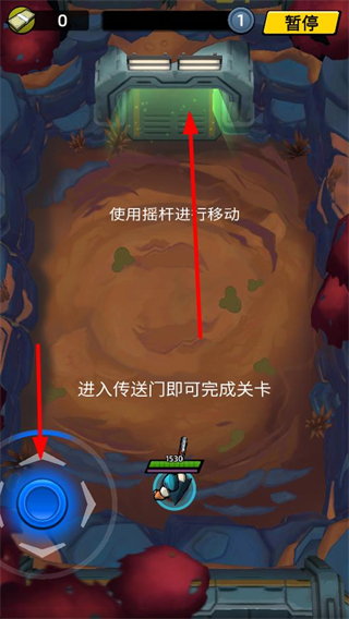 1、使用搖桿操控角色移動,前往傳送門完成關卡,通過搖桿操作熟悉角色走位,開啟科幻冒險的基礎流程。
