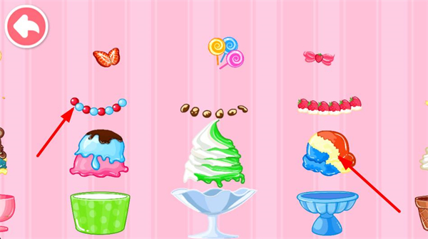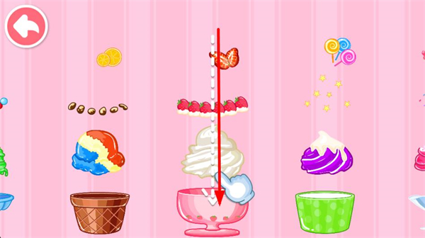 2、來到食材選擇界面,能看到多種甜品配料,比如糖果草莓等,按照提示選取對應的裝飾和食材,為制作冰淇淋做準備。