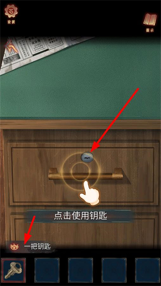 2、獲取鑰匙后,點擊抽屜鎖使用鑰匙,打開抽屜以獲取其中的線索或物品,推進游戲進程。