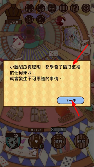 2、收集卡牌后會彈出提示文字,說明攝取物品會觸發特殊效果,點擊下一步按鈕可關閉提示,繼續推進游戲流程。