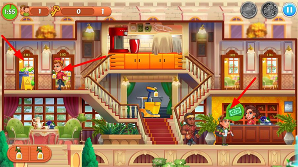 2、辦理顧客入?。嚎吹阶笊戏降漠斍瓣P卡目標,知曉需等候客人入住,客人光臨后,點擊顧客頭上的鑰匙氣泡為其辦理入住,接著挑選干凈整潔的空房間安排入住。