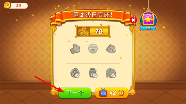 1、完成第2關后會獲得70金幣等獎勵,點擊下一個按鈕可進入新的關卡,繼續推進酒店服務的經營流程,解鎖更多內容。