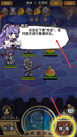 1、可點擊攻擊按鈕,對敵方進行普通攻擊,通過普通攻擊積累傷害,推進戰斗進程。