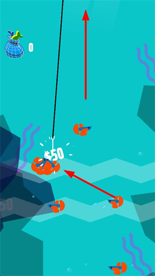 1、投放釣線捕魚:投下自己的釣線,讓其到達深海區域,操控魚鉤左右飄動,盡可能釣到更多有價值的魚。