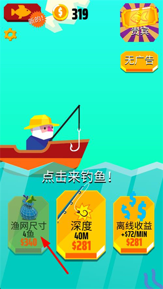 2、升級裝備屬性:使用獲得的金幣增加漁網容量、提高魚鉤下沉深度,還能提升離線時獲得的金幣數量。