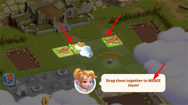 2、進入合成環節,拖動相同物品合并,完成融合操作解鎖新物品,借助合成玩法獲取關卡所需的道具資源。