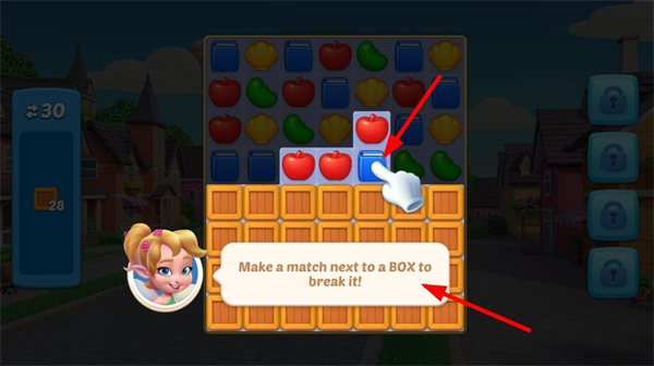 1、按照提示在箱子旁匹配相同元素,完成消除以破壞箱子,推進關卡進度,同時積累步數內的目標完成度。