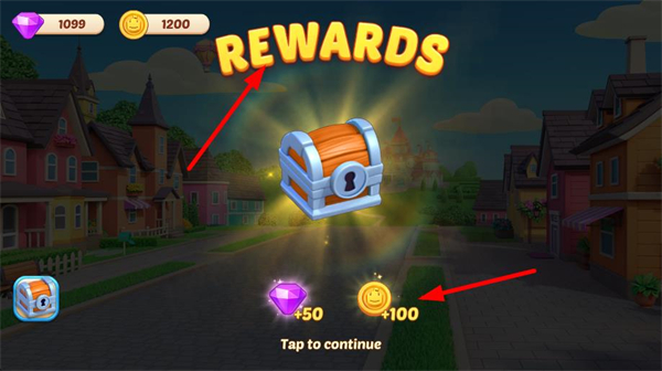4、完成關卡后進入獎勵界面,獲得鉆石和金幣獎勵,點擊繼續按鈕,積累資源解鎖后續的消除與合成關卡內容。