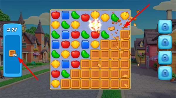3、消除的過程觸發爆炸特效,破壞更多障礙與元素,快速推進關卡進度,同時查看左側的進度計數了解完成情況。