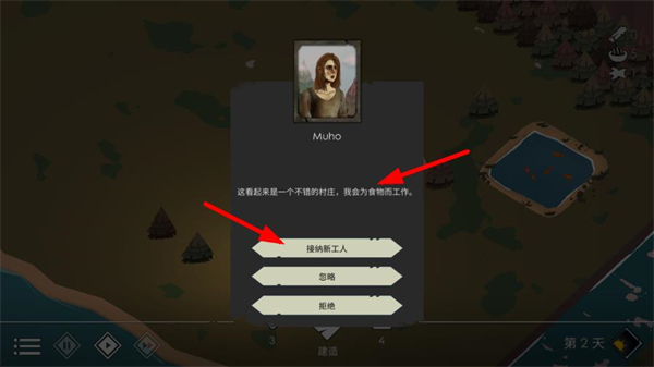 1、界面出現角色Muho的對話,提示這里是村莊,可選擇接納新工人選項,完成選擇后即可新增工人,擴充村落的人力。