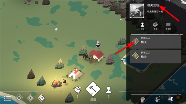 2、進入樵夫營地界面,在右側選擇樵夫選項,向該營地派遣工人,這些工人會負責收集和儲存木材,為村落提供資源支持。