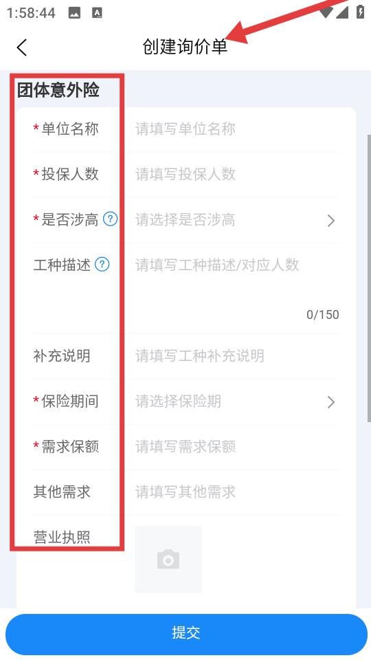 3、進入恒快保的團體意外險創建詢價單界面,表單需填寫單位名稱、投保人數、是否涉高、工種描述等信息等等,填完即可提交。