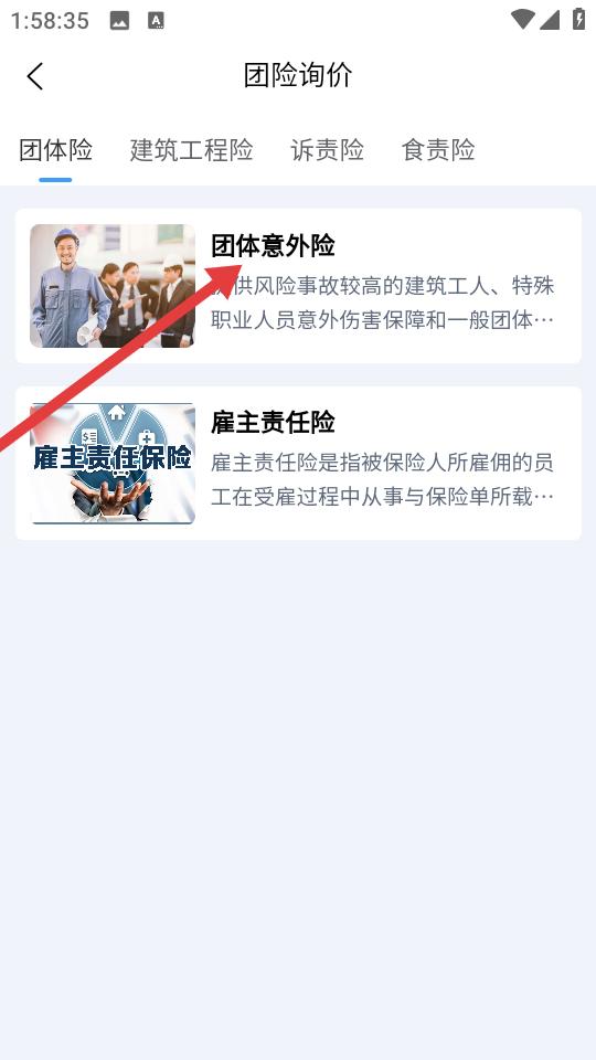 2、團險詢價頁面頂部分類有團體險、建筑工程險、訴責險、食責險,當前展示團體意外險和雇主責任險,前者為高風險職業提供意外保障。