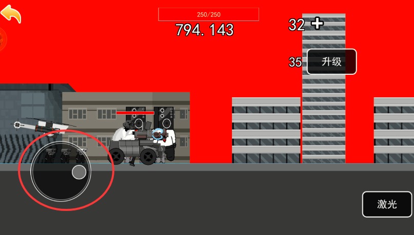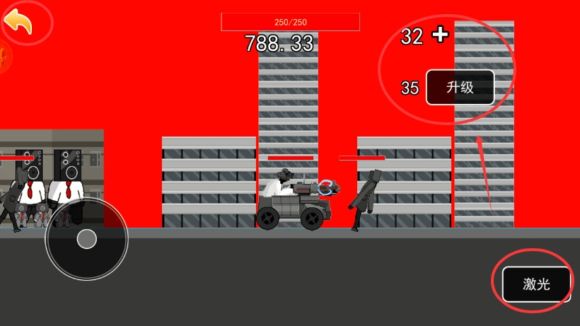 1、點擊主界面"畸變逆襲"按鈕進入戰斗,消耗積累的能量可激活升級變形功能,右下角激光圖標用于釋放強力攻擊。