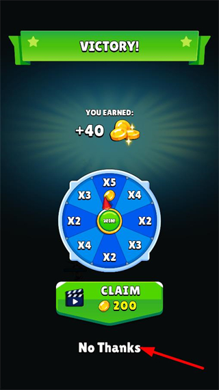 4、戰斗勝利后獲得金幣獎勵,選擇No Thanks按鈕跳過額外獎勵環節,結束當前關卡,準備進入下一關挑戰。