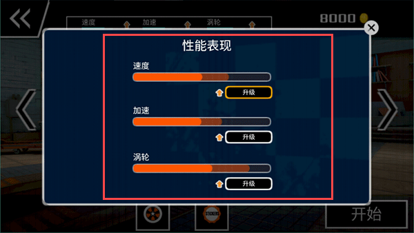 2、購買賽車之后,單擊屏幕頂部的性能欄還可以花費金幣升級汽車性能。