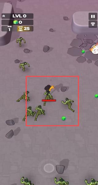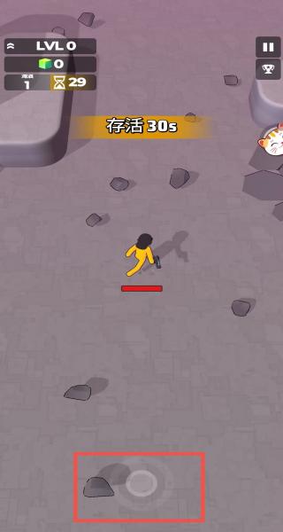 1、進入游戲后,操控角色在場景內移動,場景中散布著石塊等障礙物,通過屏幕下方的虛擬搖桿控制角色走位,躲避可能出現的危險,確保角色存活。