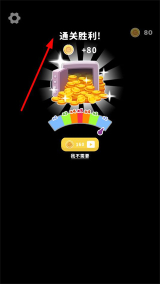 2、通關后出現通關勝利界面,獲得80金幣,還有倍數進度條,可選擇觀看視頻獲取160金幣獎勵。