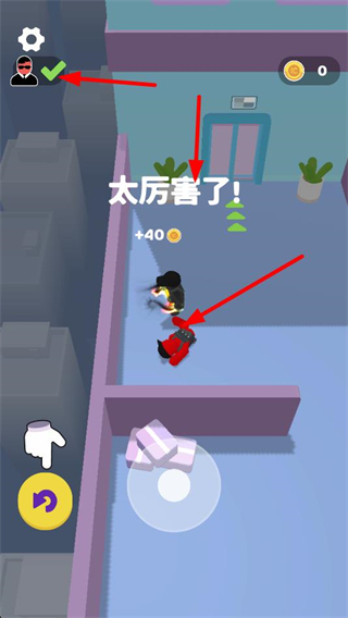 1、操控角色行動,成功襲擊目標角色后會出現太厲害了提示,同時獲得40金幣,界面還有功能按鈕可輔助操作推進流程。