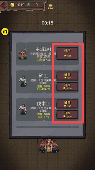 3、在主城功能菜單中選擇單位雇傭選項后,進入雇傭界面,界面左側列表分別展示伐木工與礦工圖標。