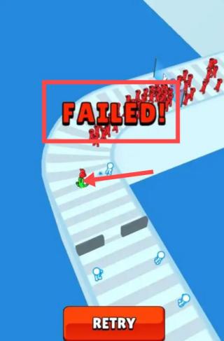 3、當玩家無法躲避障礙或者被后面追趕的小人追到時游戲將直接判為失敗重新開始。