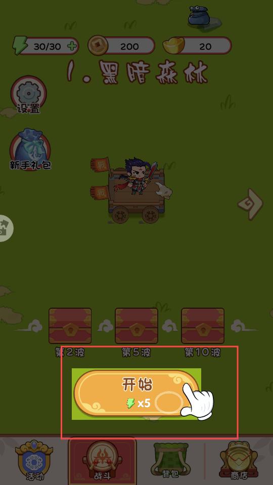 2、在游戲主界面,找到黑暗森林區域,點擊下方標有開始且消耗5點能量的按鈕,開啟關卡。