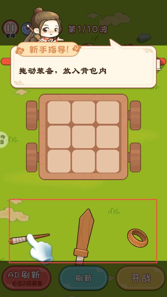 3、進入關卡后,根據新手指引提示,拖動界面下方顯示的裝備,將其放置到上方的背包格子內,完成裝備收集操作。
