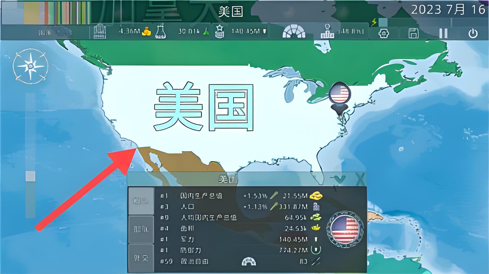 2、選定國家后將玩家將進入該國對應的地圖界面,例如控制美國如下圖所示。