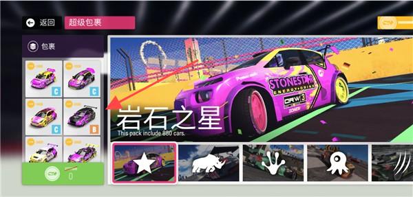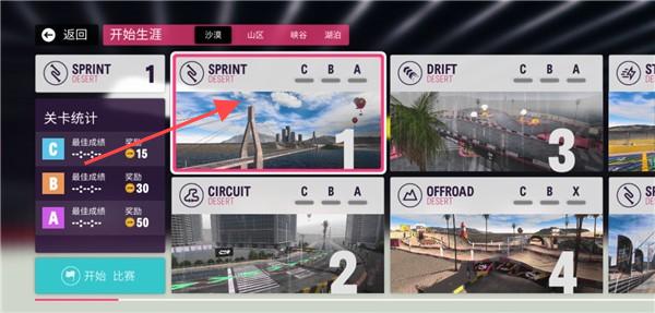 3、關卡模式選定:購買賽車后,點擊玩進入關卡選擇界面,根據個人喜好與挑戰需求,挑選不同難度關卡或游戲模式,點擊左上角開始游戲。