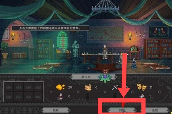 1、貝蘭擁有一支龐大的軍隊,而我們的軍隊僅有100人,進入議事廳,點擊盟友按鈕如圖所示,并給塔里斯國王送信求援。