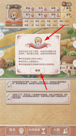 3、進入幼年期階段,查看該階段的規則說明,比如時間流逝單位和屬性提升規則,點擊繼續按鈕推進角色成長。