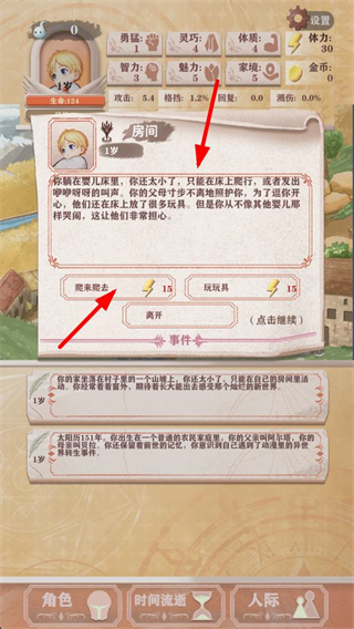 4、在房間場景的事件界面,選擇比如爬來爬去的互動選項,消耗體力來推進角色的幼年互動,積累成長進度。