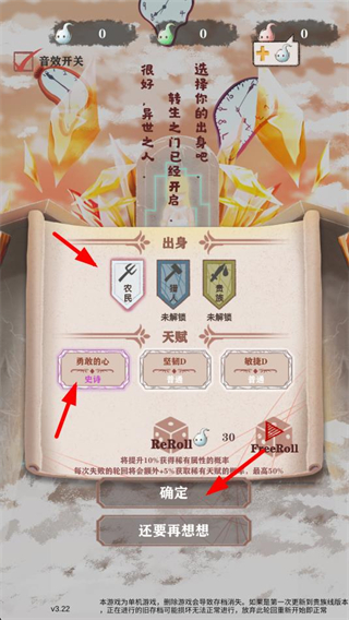 1、選擇出身比如農民,搭配天賦比如勇敢的心,點擊確定按鈕,開啟異世轉生的角色創建流程。