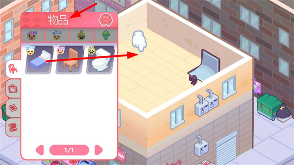 4、進入物品界面選擇家具類物品,將其布置到解鎖的房間里,豐富房間內的設施,提升空間的實用性。