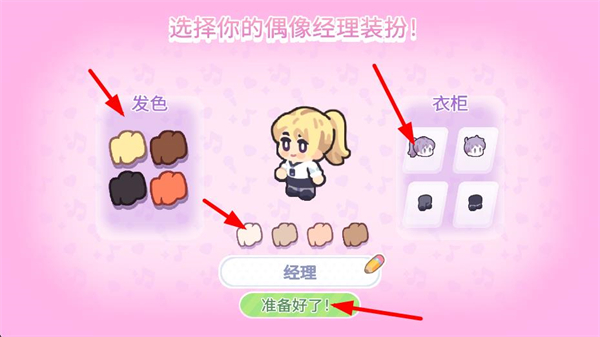 1、選擇偶像經理的裝扮,可調整發色、衣服等樣式,確認裝扮后點擊準備好了,即可完成經理形象設置。