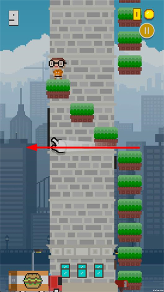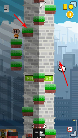 1、操控角色在建筑外的花盆間跳躍,通過方向操作移動角色,推進進度,體驗像素風的休閑冒險樂趣,積累游戲積分。