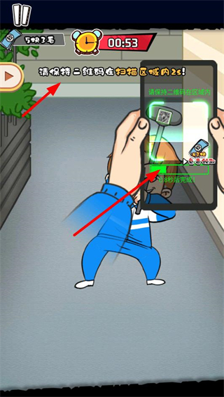 4、進入新關卡按照提示保持二維碼在掃描區域內2秒,完成該步驟的操作,推進關卡進度。